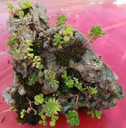 Sometimes obsidian, local rocks, and other items may be added to the glass in this fiery fusing process. The finished sculpture may be planted, usually with succulents, and perhaps fanciful figures might be added. (Look for them, they may be hiding.)